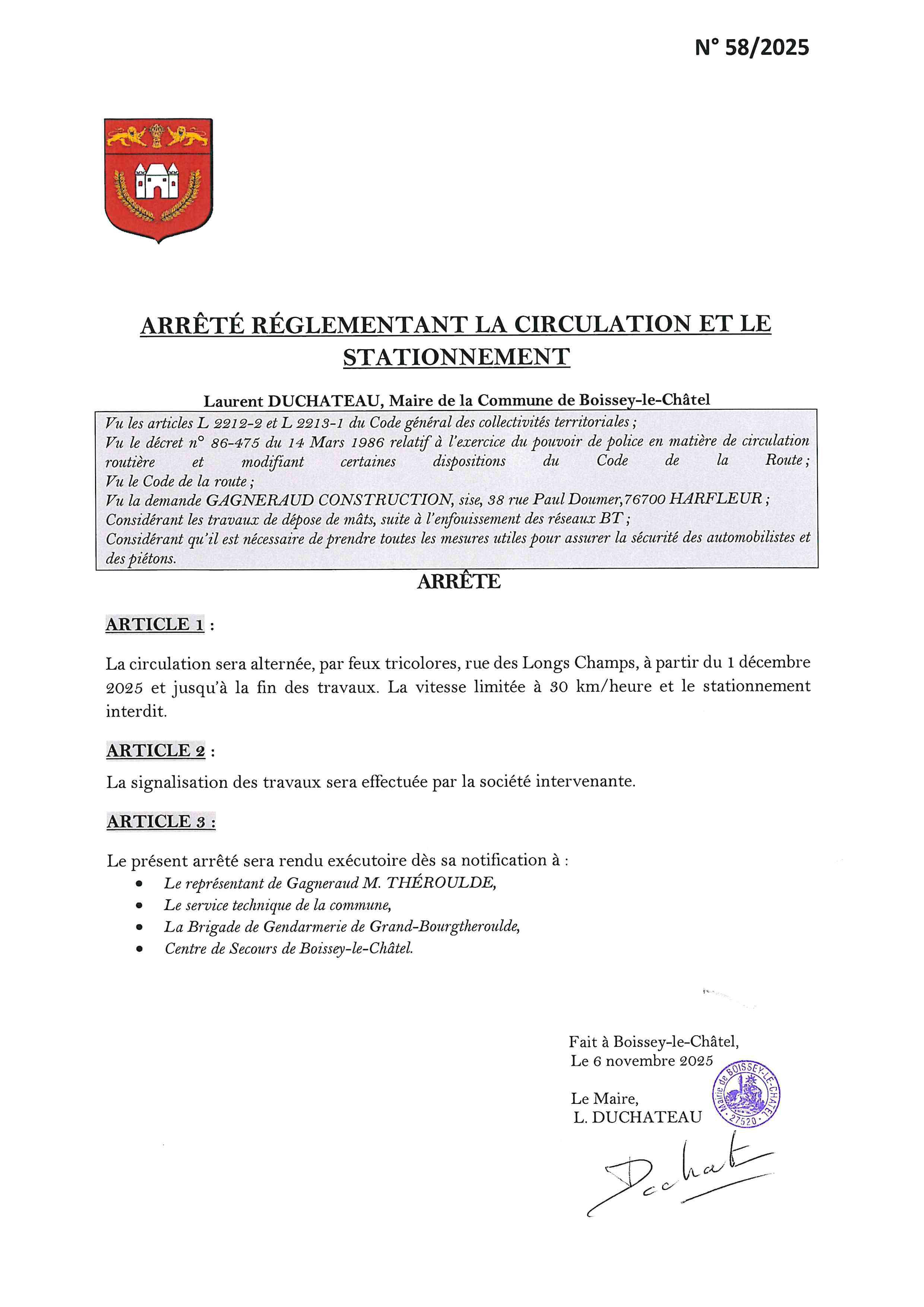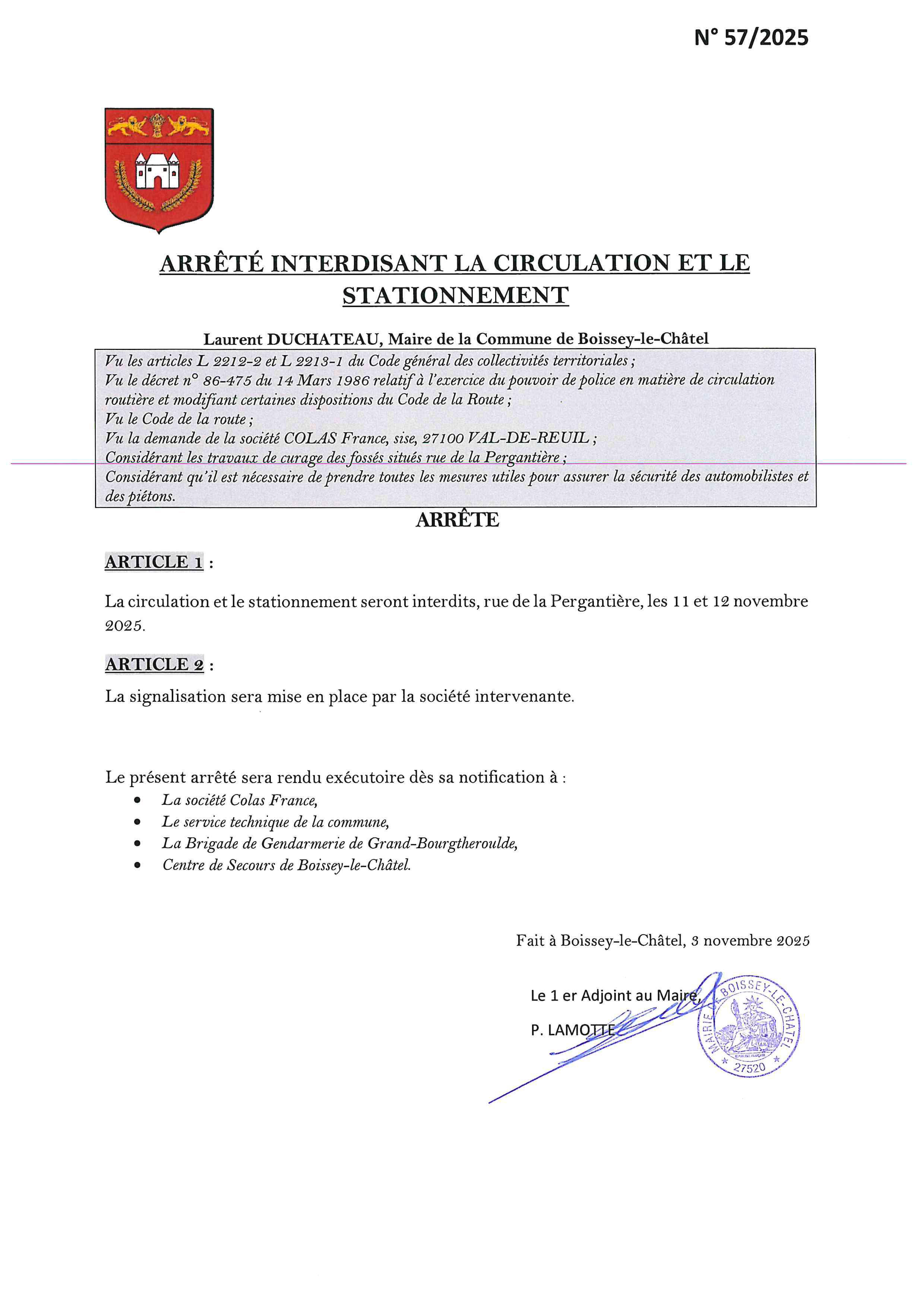 Arrêtés Municipaux rue de la Pergantière et rue des Longs Champs du 5/11/25